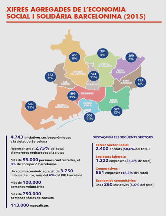 A Barcelona, existeixen gairebé 4.800 experiències d’economia cooperativa, social i solidària. Aquest sector agrupa iniciatives diverses com cooperatives en la salut o l’ensenyament, equipaments culturals de gestió comunitària, entitats de finances ètiques i bancs del temps, mutualitats de previsió social, distribuïdores de productes ecològics i de comerç just, grups de criança compartida i de consum agroecològic, cooperatives d’arquitectes i d’ambulàncies, horts urbans, mercats d’intercanvi, grups locals de cooperatives d’energia verda i de telecomunicacions. Totes elles intenten resoldre necessitats des d’una vessant col·lectiva i transformadora.