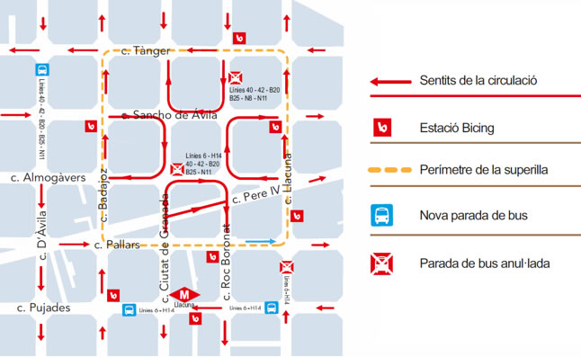 - Els vehicles privats que entrin en el perímetre comprès entre els carrers de Badajoz, Pallars, Llacuna i Tànger estaran obligats a girar en totes les interseccions interiors i hauran de transitar a un màxim de 10 km/h