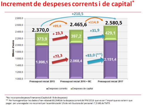 Els comptes estan xifrats en 2.580,5 milions d’euros, el que significa un increment del 4,7% respecte els recursos disponibles aquest 2016. La proposta que ha elaborat el Govern prioritza la despesa social que arriba als 323,4 milions d’euros i aposta per la reactivació econòmica, amb un augment sostingut de la partida de promoció econòmica i ocupació que arriba als 70 milions. Els pressupostos augmentem partides com la de cultura, un 13% i que arriba als 144 milions d’euros, una xifra històrica. Pel que fa a les inversions, es preveu un increment del 8% arribant als 429,1 milions d’euros, 31,9 milions més que aquest any. Es tracta, per tant, d’un pressupost expansiu que creix en més de 100 milions d’euros respecte al total disponible aquest 2016 i en més de 210 milions si es compara amb el pressupost inicial del 2015.