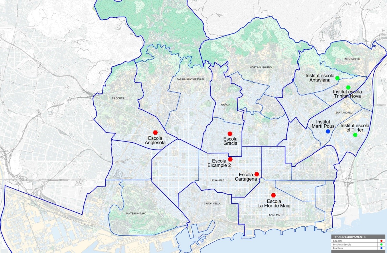 – Al districte de l’Esquerra de l’Eixample, les escoles Eixample I, Eixample II i Cartagena.