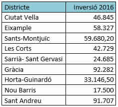 L’Ajuntament de Barcelona va invertir 467.000 euros per a projectes de comerç de proximitat als barris de la ciutat al llarg de 2016. Els projectes s’han centrat en dinamització dels barris en zones afectades per obres de llarga durada, zones properes a centres comercials, àrees amb baixa densitat comercial o aquelles on els els últims anys hi ha hagut una disminució clara del comerç de proximitat, entre altres casuístiques.