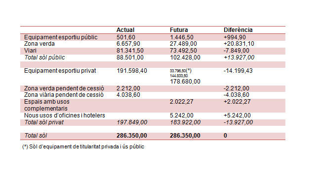 Pel que fa al còmput dels sòls destinats als usos diversos de l’àmbit, la proposta integra un guany evident de sòl públic, amb gairebé 14.000 m2 més que ara. El sòl reservat per a equipaments públics esportius serà d’uns 1.500 m2, i la zona verda pública augmenta en més de 20.000 metres quadrats i serà d’uns 27.500 m2.