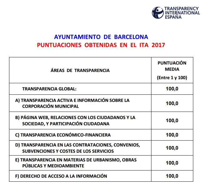 L’Ajuntament de Barcelona ha obtingut la màxima puntuació en l’Índex de Transparència dels Ajuntaments (ITA) 2017, elaborat per l’organització Transparència Internacional Espanya. L’informe, que arriba a la seva sisena edició, analitza el nivell de transparència dels 110 ajuntaments més importants de l’Estat espanyol, utilitzant un conjunt de 80 indicadors, dividits en sis àrees de transparència.