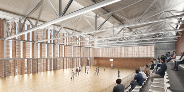 El vestíbul es troba a la planta baixa, amb una zona de triple alçada que relaciona visualment els diferents espais. En aquesta mateixa planta es trobaran també altres espais com el bar, etc. També des del vestíbul de la planta baixa es podrà accedir a una de les graderies, la que correspon a les pistes del nivell inferior. A la planta primera es trobarà l’altra pista poliesportiva, mentre que a la planta segona s’ubiquen les graderies i sales de formació i activitats. Una banda central recorrerà l’edifici de dalt a baix, organitzant els nuclis, les grades, els serveis i les instal·lacions sobreposats a diferents nivells en una única peça.