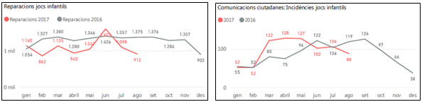 A les àrees de jocs infantils hi ha hagut un augment de les reparacions durant el mes de juny, quan s’ha arribat a les 1.601 actuacions. Al juliol, se n’ha fet 1.098, i a l’agost, 912. Aquest creixement ha fet que baixessin les comunicacions ciutadanes d’incidències en aquests espais.
