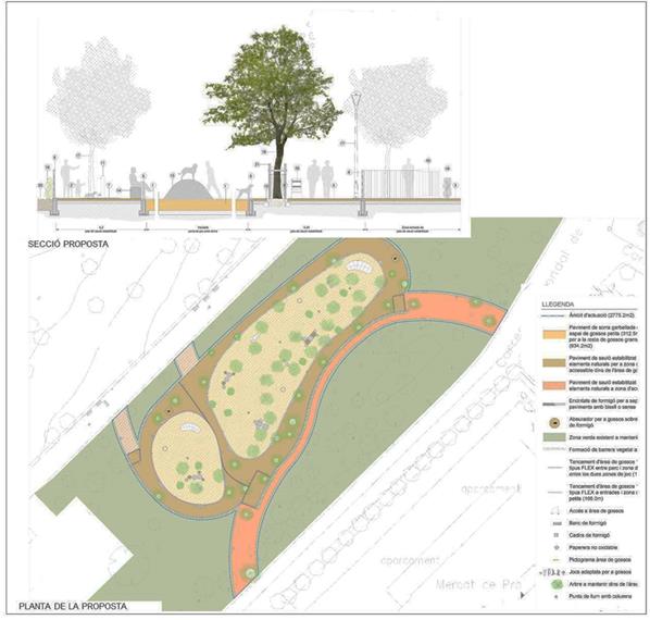 Tot l’espai es delimitarà amb tancaments metàl·lics i reforçats amb vegetació. Els paviments seran de materials naturals i concretament les zones destinades als jocs dels gossos es pavimentaran amb materials específics i adequats per a ells, com ara sorra garbellada. En aquests espais, a més a més, s’instal·laran elements de joc per als animals emprant materials reciclats: tubs de formigó, peces de fusta, peces de formigó. Es crearan plataformes de diferents nivells i dunes de diferents alçades per afavorir l’amagatall, la curiositat, i en definitiva el joc caní. L’espai també tindrà un abeurador adaptat per a gossos.