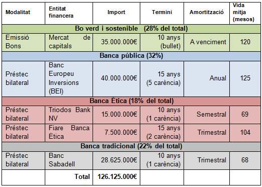 L’emissió d’aquests bons es complementarà amb el finançament amb banca ètica i a través de la banca pública (BEI) i amb les operacions d’endeutament amb la banca tradicional