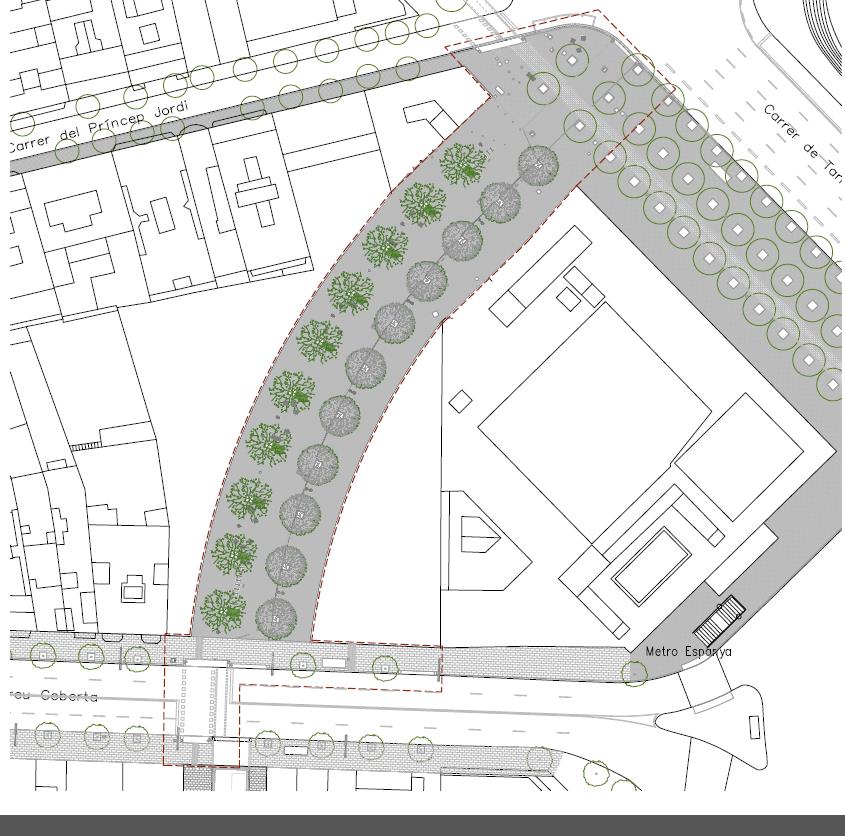 Pel que fa a arbrat, a la vorera est es plantaran acàcies del Japó, i a la plataforma, mèlies. A la vorera del carrer de Tarragona també es disposarà nou arbrat en continuïtat amb el ja existent, format per acàcies roses. A més, s’instal•larà nou enllumenat que coincidirà amb les alineacions de l’arbrat. I es col•locarà nou mobiliari urbà, com ara cadires, bancs, papereres, pilones i aparcaments de bicicletes.