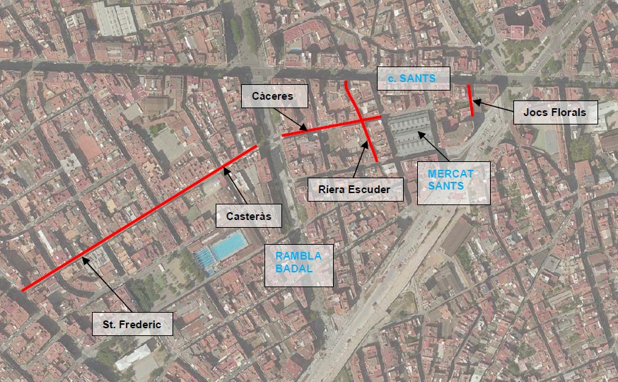 L’Ajuntament de Barcelona ha finalitzat la conversió a plataforma única de l’eix conformat pels carrers de Sant Frederic, Casteràs i Càceres; el carrer de la Riera d’Escuder en el tram entre el carrer de Sants i Daoíz i Velarde, i el carrer dels Jocs Florals entre el carrer de Sants i Antoni de Capmany, al districte de Sants-Montjuïc.