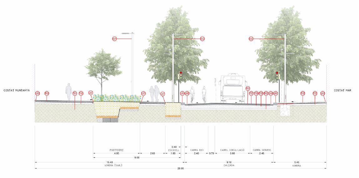 Pel que fa a les voreres, la del costat muntanya serà de gran amplada, d’uns 15 metres, i la del costat mar, d’uns 5,45 metres. Per tant, el guany d’espai destinat al ciutadà gràcies a la reforma serà notable. A cada vorera s’hi instal•larà nou enllumenat urbà, i s’hi plantaran til•lers en alineacions.