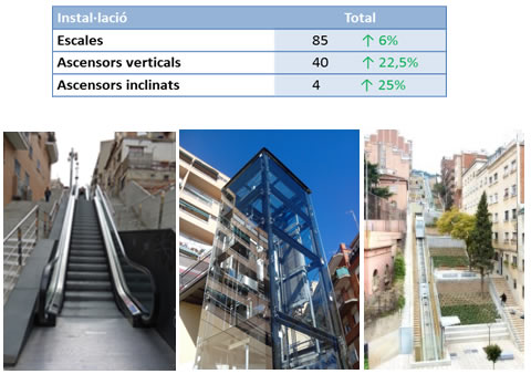 El 2015 la ciutat comptava amb 113 instal·lacions (79 escales, 31 ascensors verticals i 3 ascensors inclinats). A dia d’avui el nombre d’equips s’han incrementat en un 14% i ja arriben fins als 129 (85 escales, 40 ascensors verticals i 4 ascensors inclinats).