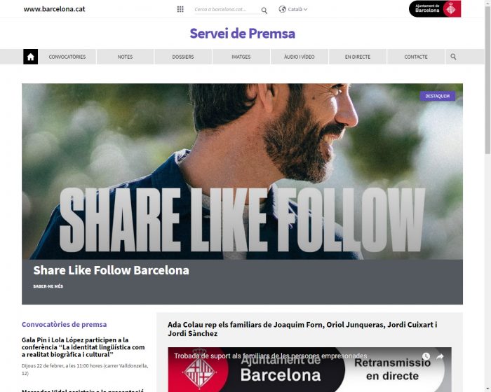 Dimecres, 21 de febrer, la Direcció de Comunicació Digital de l’Ajuntament de Barcelona posa en línia el canal d’informació, Info Barcelona (barcelona.cat/infobarcelona), i renova el lloc web del Servei de Premsa (barcelona.cat/premsa) amb la voluntat de potenciar la seva oferta informativa a la xarxa.