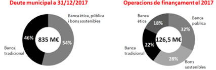 Actualment el 54% de les operacions d’endeutament de l’Ajuntament son amb banca ètica, pública i bons sostenibles. La banca tradicional només representa el 22% de les noves operacions realitzades al 2017