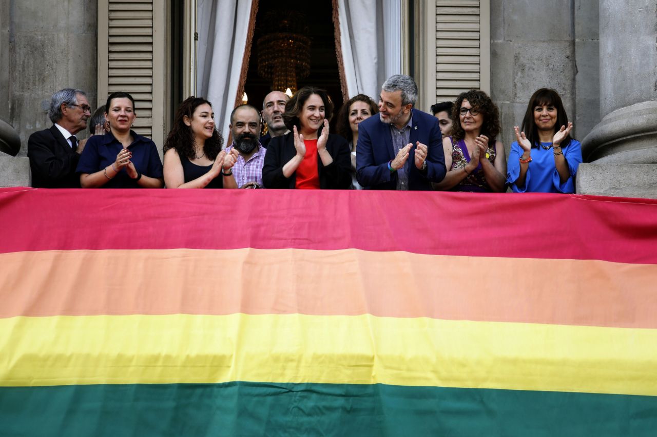 Ada Colau presideix la penjada del penó amb l’Arc de Sant Martí amb motiu de la diada per l’alliberament sexual i de gènere