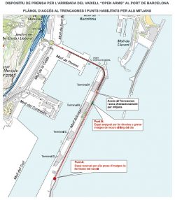 Els mitjans interessats a cobrir l’arribada de l’embarcació, s’hauran de dirigir a les 9.30 hores al Trencaones del Port (Passeig Gabriel Roca, s/n) on hi haurà habilitat el dispositiu de premsa. Segons les indicacions del mapa que adjuntem, hi haurà dos punts on els mitjans tindran accés: