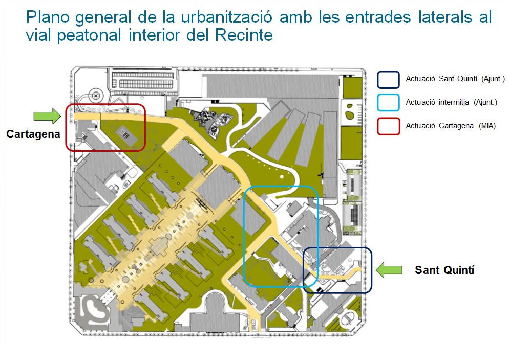 L’actuació a càrrec de l’Ajuntament de Barcelona consistirà en millorar el paviment de la zona peatonal propera al C/Sant Quintí, incrementar la vegetació i l’arbrat als laterals, i instal·lar nou enllumenat i nova senyalització. També s’instal·larà un sistema per al control i tancament d’accés, perquè aquest espai es tancarà en horari nocturn per garantir la seguretat i per fer-ho compatible amb els usos del recinte.