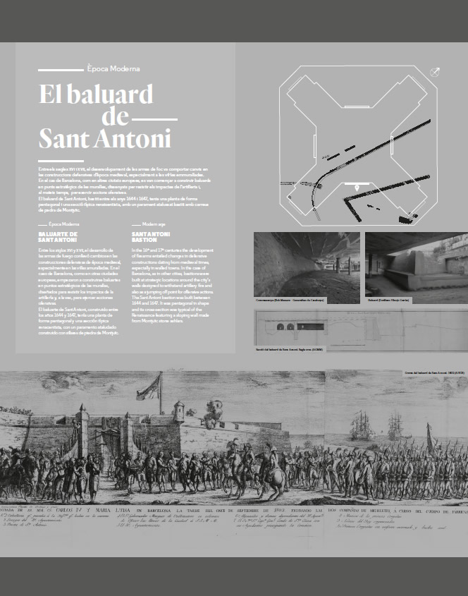 Entre els segles XVI i XVII, el desenvolupament de les armes de foc va comportar canvis en les construccions defensives d’època medieval, especialment a les vil·les emmurallades. En el cas de Barcelona, com en altres ciutats europees, es van començar a construir baluards en punts estratègics de les muralles, dissenyats per resistir els impactes de l’artilleria i, al mateix temps, per exercir accions ofensives. El baluard de Sant Antoni, bastit entre els anys 1644 i 1647, tenia una planta de forma pentagonal i una secció típica renaixentista, amb un parament atalussat bastit amb carreus de pedra de Montjuïc.