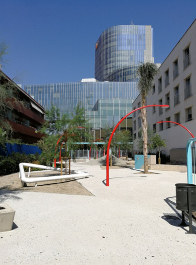 L’espai és polivalent i està pensat per infants, per fomentar la relació entre famílies i gent grant i infants i compta també amb horts urbans