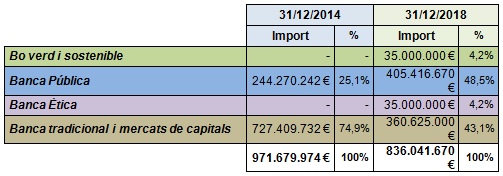 El pes de la banca tradicional s’ha reduït aquest mandat del 74,9% a 43,1% degut a l’entrada de noves fonts de finançament, com l’emissió del Bo Sostenible (35M€), la Banca Ètica (35M€) i el recurs de la banca pública (250M€)