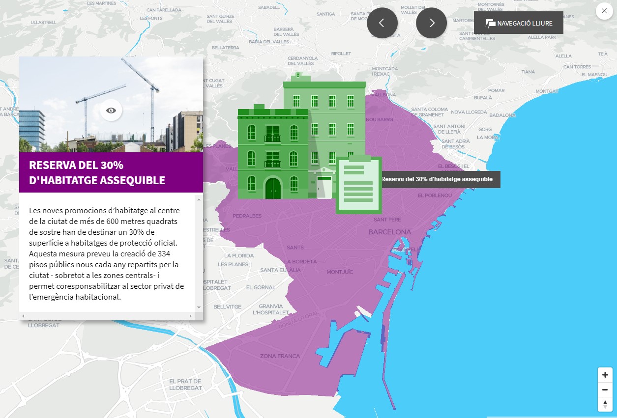 A través d’un plànol de Barcelona, es pot explorar a partir dels cinc eixos descrits abans o bé navegar lliurement per anar coneixent una per una les mesures. Cadascuna d’elles està situada geogràficament sobre el mapa i compta amb una fitxa descriptiva.