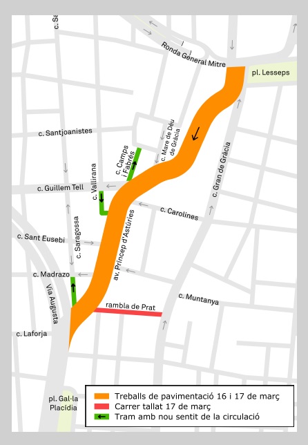 Amb motiu d’aquestes obres de pavimentació diumenge 17 de març, es mantindrà un únic carril de circulació en sentit descendent i es tallarà el trànsit de la rambla del Prat entre les 8 hores i les 16 hores. També es procedirà a canviar el sentit de la circulació de forma definitiva dels carrers de Camps i Fabrés, Vallirana i Saragossa.