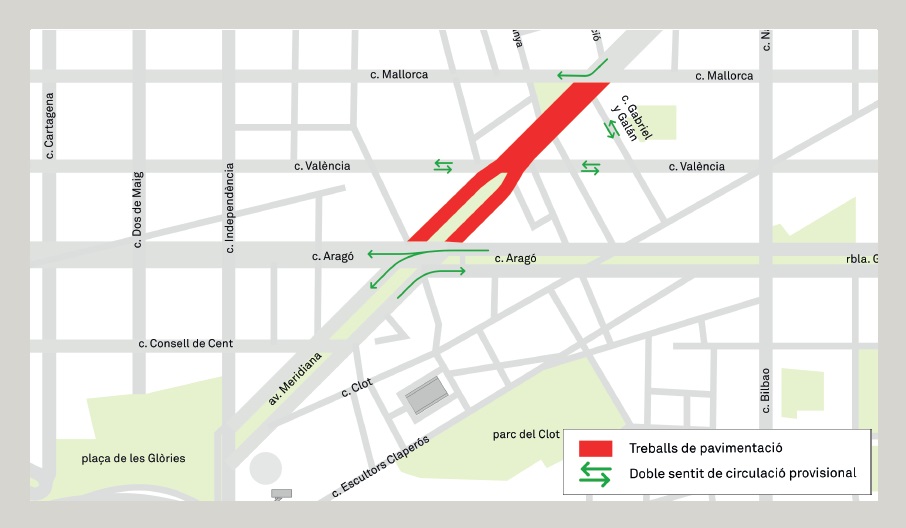 Durant els treballs de pavimentació es mantindrà operatiu un mínim pas de vianants en cada tram i el carril bici es desviarà pel carrer d’Aragó, el sentit sortida de la ciutat, i pel carrer de Navas de Tosola, el sentit d’entrada.