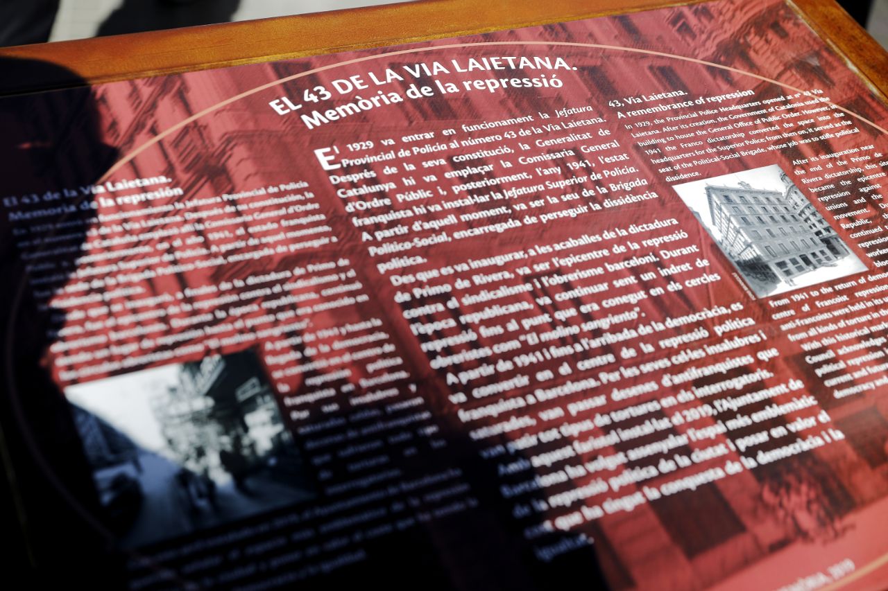 Durant l’acte s’han llegit textos de testimonis de persones represaliades. També s’ha col•locat una senyalització al numero 43 de Via Laietana, en memòria de la repressió. Segons el text, des que es va inaugurar, a les acaballes de la dictadura de Primo de Rivera, la Jefatura Provincial de Policía va ser l’epicentre de la repressió contra el sindicalisme i l’obrerisme barceloní.