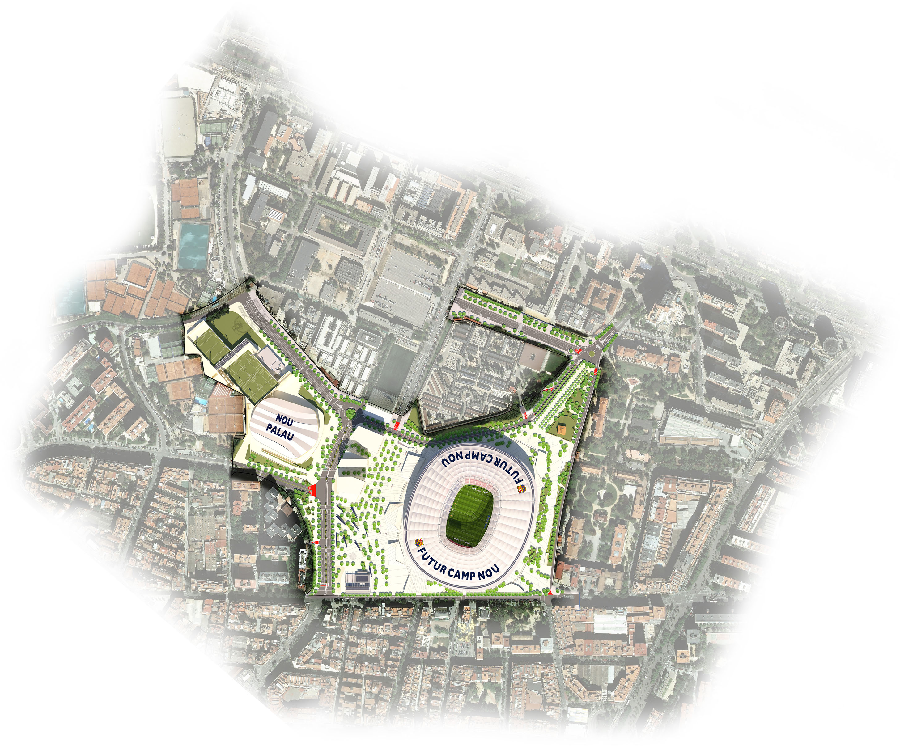 El recinte, doncs, s’integrarà en el barri de la Maternitat i de Sant Ramon i serà permeable, amb nous espais privats oberts a l’ús públic sense tancaments que mantindran una continuïtat amb la resta d’espais públics, vials i verds que l’envolten i que fan front al Camp Nou i l’actual Palau Blaugrana i Miniestadi.
