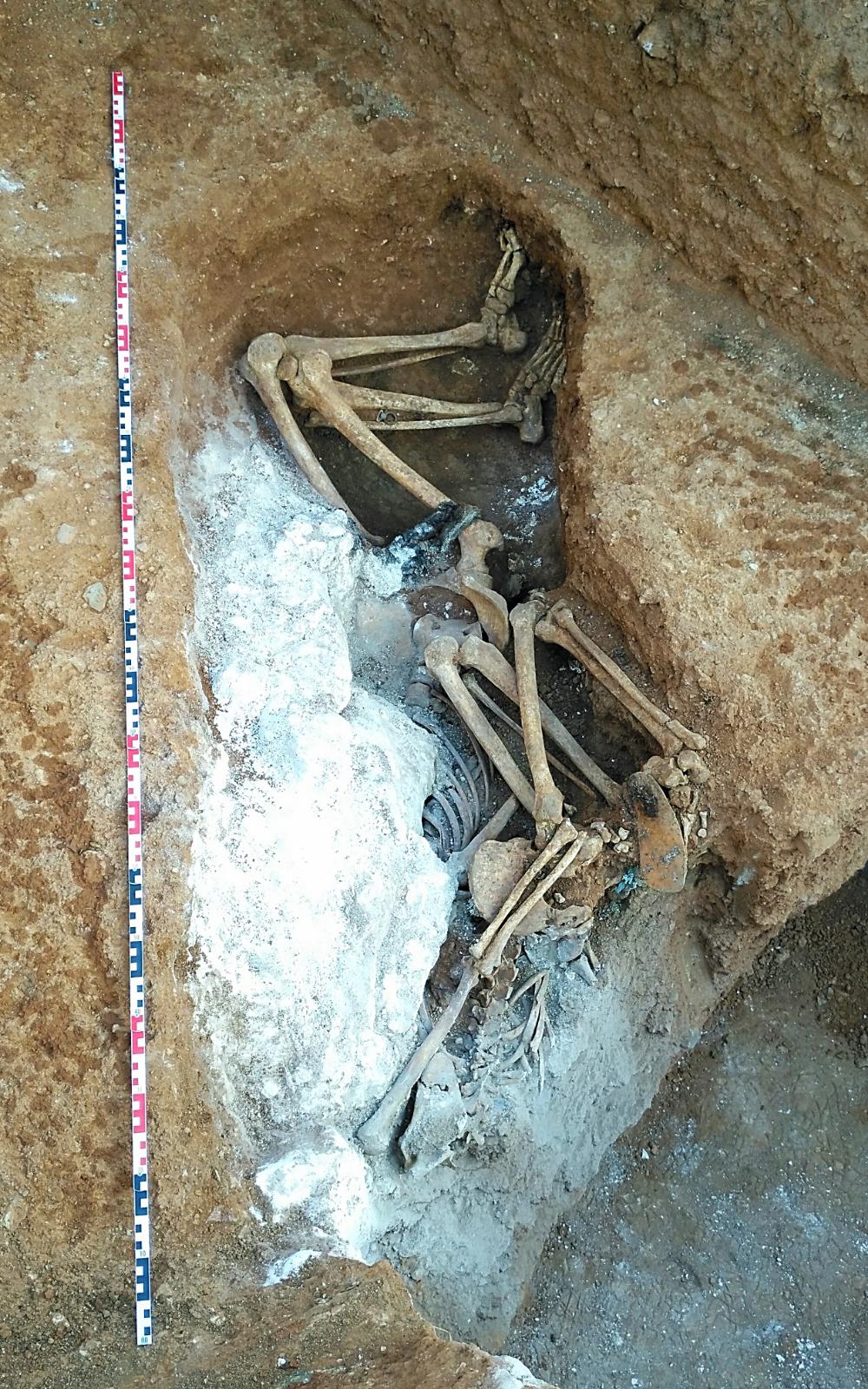 Tal com marca la llei, els tècnics del servei d’arqueologia van elaborar el projecte d’intervenció arqueològica i l’empresa d’arqueologia contractada per la promoció s’han fet càrrec del control i seguiment arqueològic de la resta de treballs, així com la documentació de l’enterrament localitzat. Els treballs han permès confirmar l’existència d’una fossa en un dels talls d’un pou de fonamentació, i s’han pogut recuperar les restes òssies de dos individus adults cobertes amb calç viva..