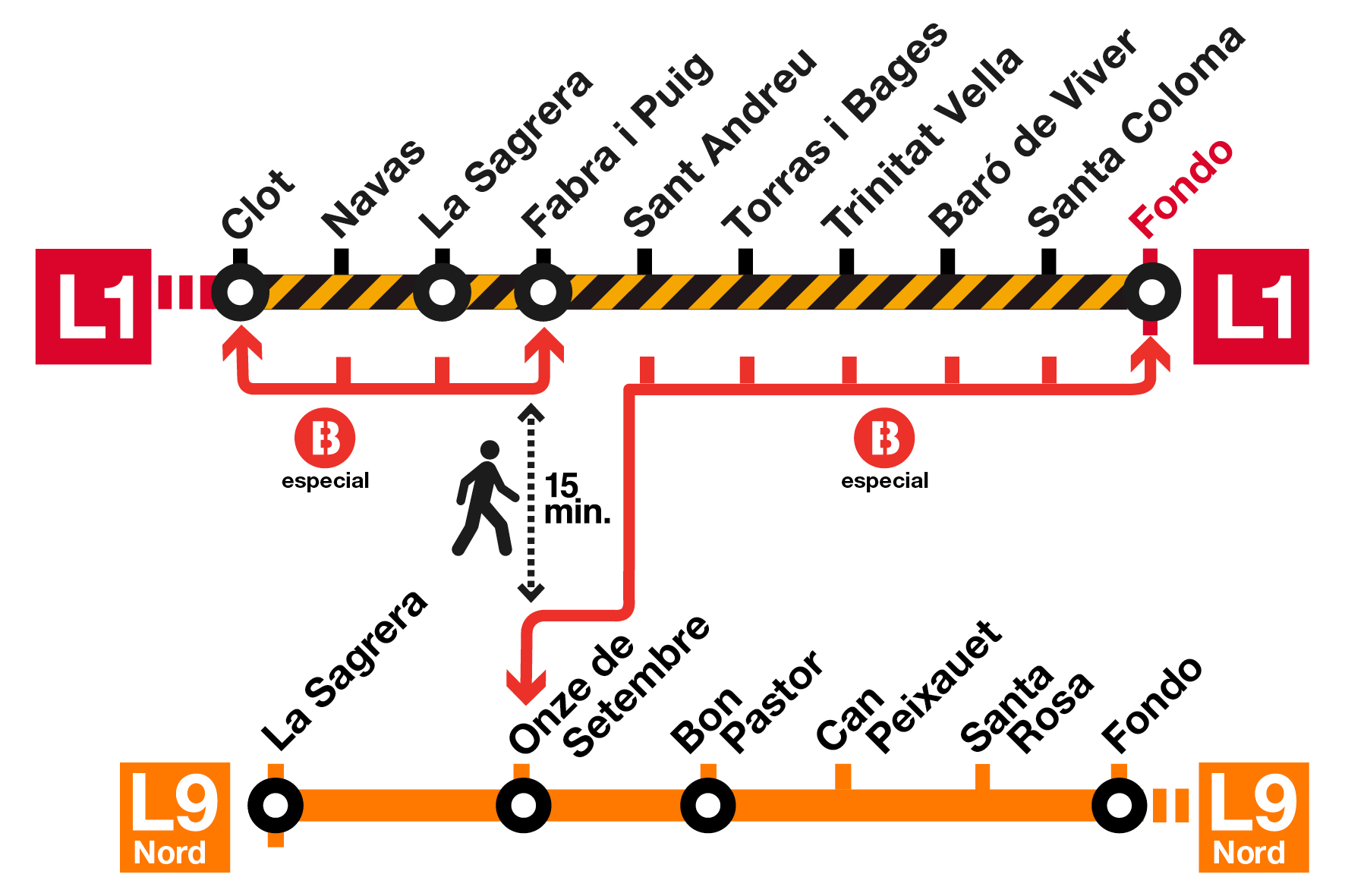 Així, la línia 9 Nord de metro (La Sagrera – Can Zam) i els trens de Rodalies seran les alternatives principals durant el tall, aquests a través de les estacions de Sant Andreu Comtal (R2 / R2 Nord), Sant Andreu Arenal (R3 i R4), La Sagrera – Meridiana (R3 i R4) i El Clot – Aragó (R2 / R2 Nord), junt amb dos serveis especials d’autobús que habilitarà TMB amb la funció d’enllaçar aquests transports ferroviaris i les estacions tancades de la línia 1.