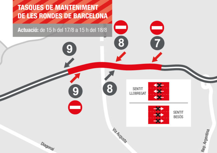 El tram afectat en sentit Besòs és el comprès entre la sortida 9 a Sarrià i la incorporació 8 a la Via Augusta. El trànsit es desviarà per la calçada lateral entre les rotondes de Can Caralleu i Bellesguard i s’incorporarà a la ronda en la incorporació 7. Mentre durin els obres, l’accés des de túnels de Vallvidrera a la ronda, sentit Besòs, estarà tancat i el trànsit es desviarà per la plaça de Borràs. La incorporació 8 des de la Via Augusta estarà totalment operativa.