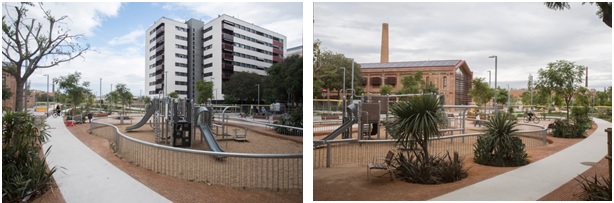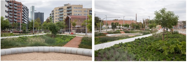 Alhora, es compta amb un Sistema urbà de drenatge sostenible (SUDS) que permet aprofitar les aigües pluvials recollides dins el mateix àmbit per al rec amb aigua freàtica dels arbres i arbustos.