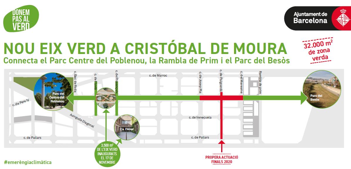 La conversió del carrer de Cristóbal de Moura en un nou eix verd de ciutat ha completat la primera fase. L’Ajuntament ha acabat les obres de reurbanització de la via entre els carrers de Fluvià i Provençals, que suposen el primer pas de la transformació de tot el carrer en un gran eix pacificat on l’arbrat i els espais de convivència, lleure i salut siguin els grans protagonistes.