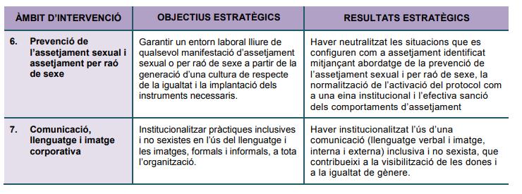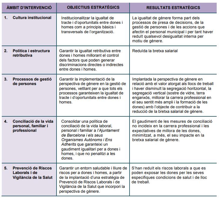 Estableix objectius estratègics per a 7 àmbits d’intervenció: cultura institucional, per integrar la igualtat de tracte i d’oportunitats com a principis bàsics i transversals de l’organització; política retributiva; implementació de la perspectiva de gènere en la gestió de persones; conciliació de la vida personal, familiar i professional; prevenció de riscos laborals i vigilància de la salut; prevenció de l’assetjament sexual; comunicació, llenguatge i imatge corporativa.