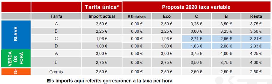 Així, l’estacionament regulat en superfície per a no residents s’establirà en funció del nivell de contaminació del vehicle segons els criteris definits per la DGT incorporant criteris ambientals, tant pel que fa les tarifes en els serveis d’Àrea Blava, com Àrea Verda en ús forà.