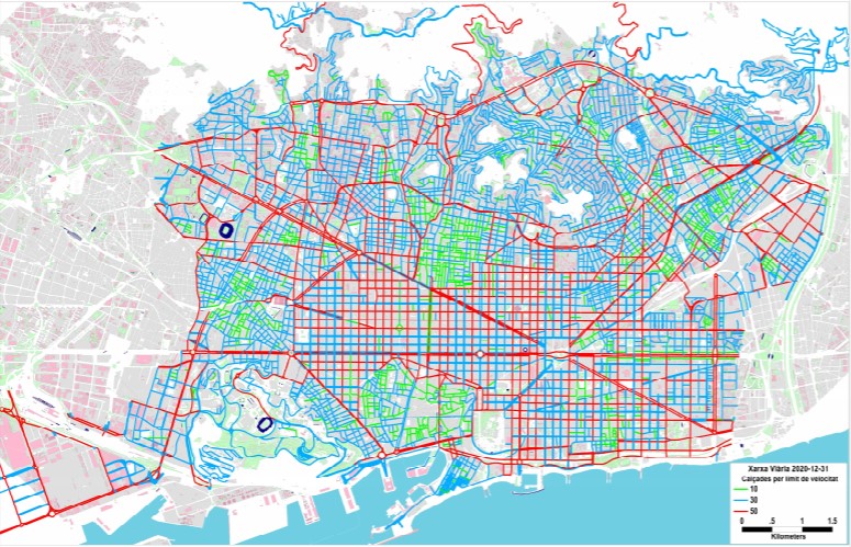 Planòl de la xarxa viària de la ciutat amb la velocitat límit de cada via (desembre 2020)