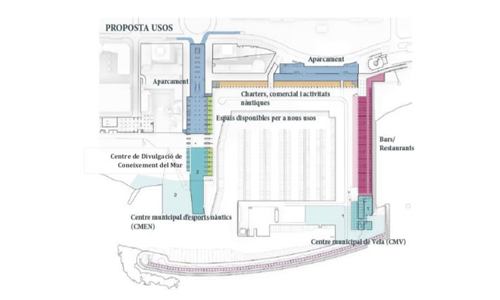 En definitiva, es planteja com un espai que convidi a fer-hi vida ciutadana, amb la nàutica popular, l’esport i la divulgació com a activitats centrals amb nous espais vinculats a la promoció econòmica i de foment a l’economia blava. Per implementar aquest nou model, caldrà adequar els espais i les edificacions actuals com l’ampliació del Centre Municipal de Vela, al moll de Gregal i la construcció d’un nou Centre Municipal d’Esports Nàutics, al moll de la Marina. Aquest nou equipament disposarà d’una plaça d’accés des del nou espai de vianants de l’eix Marina i des de la cota de platges.