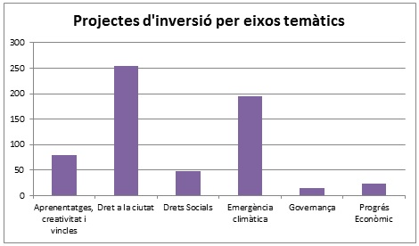 Quan ja ha passat un mes des de l’inici del procés, s’han presentat un total de 640 projectes d’inversió als 10 districtes de la ciutat. Els eixos sobre els quals s’han introduït més propostes són el de dret a la ciutat, és a dir, urbanitzacions i millora d’espais públics, accessos a instal•lacions, equipaments de barri, millora de zones d’estada, etc, i també el d’emergència climàtica.