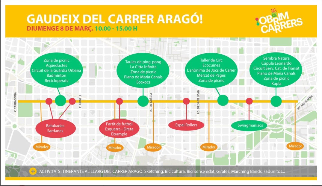 - Aragó: (tram entre Avinguda Meridiana i carrer Tarragona). El tall viari s’iniciarà a les 7:00 hores i durarà fins a les 17:00 hores i les activitats ciutadanes tindran lloc entre les 10:00 i les 15:00 hores. En total s’han programat una trentena d’iniciatives. Hi haurà activitats fixes (zones de pícnic, pistes de bàdminton, taules de ping pong, un piano on els ciutadans podran tocar, taller de circ, jocs al carrer, música); activitats ciutadanes en horaris concrets (batukades, sardanes, partit de futbol entre veïns de la Dreta i de l’Esquerra de l’Eixample, espai Rollers, swing); activitats itinerants (espectacles de carrer, martxing bands, bicis sense edat o recorreguts ciclistes per alguns dels edificis més emblemàtics del carrer Aragó).
