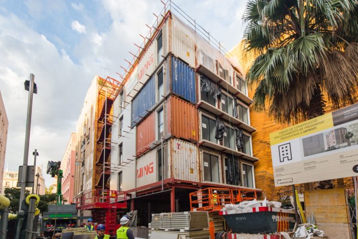 El procés constructiu de l’edifici s’inicia amb la construcció d’una planta baixa d’estructura metàl·lica que genera espais diàfans per donar espai a un equipament de barri, la porteria d’accés a l’allotjament i la bugaderia, sobre la qual es van apilant els mòduls. Aquests mòduls s’uneixen entre ells per passeres que donen accés a una escala i dos ascensors. Finalment, s’instal·len les noves façanes amb balcons per a cada allotjament i una coberta verda que permeten l’aïllament tèrmic de l’edifici.