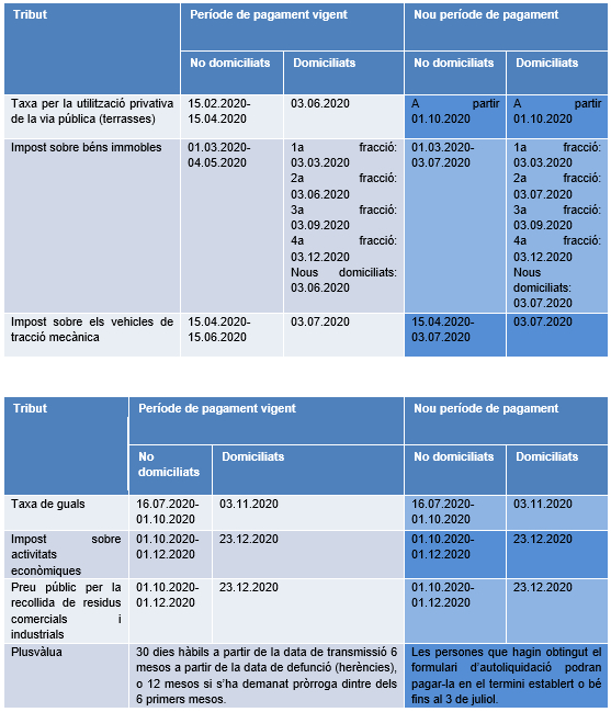 Les liquidacions dels diferents tributs, com per exemple l’IBI, IAE etc., autoliquidacions de l’Impost sobre Construccions, Instal·lacions i Obres (ICIO), provisions de constrenyiment i diligències d’embargament amb data final de pagament posterior al 18 de març, quan van començar els efectes fiscals del decret llei 8/2020 de 17 de març, es podran pagar fins el 3 de juliol.