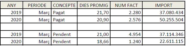 L’Ajuntament ha aconseguit reduir els terminis de pagaments de les factures durant aquest mes de març fins als 20,09 dies des de la data de presentació de la factura al registre, tot i que s’han presentat al mes de març més factures que en els mesos anteriors i que la majoria de la plantilla municipal treballa de forma telemàtica per les mesures de confinament.