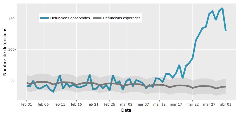 Pel que fa a la informació sobre els enterraments de residents de la ciutat de Barcelona s’observa igualment un augment global de les defuncions registrades. L’observació del nombre d’enterraments s’utilitza habitualment en la vigilància de l’evolució de l’epidèmia de la grip estacional, però també pot servir per millorar el monitoratge de l’epidèmia actual causada pel nou coronavirus SARS-nCov-2, atès que permet visualitzar l’increment de la mortalitat a la ciutat en relació a les defuncions esperades en aquesta època de l’any. Així doncs, des de l’1 de març a l’1 d’abril s’han produït un total de 2.629 defuncions entre persones residents a la ciutat de Barcelona. La xifra esperable, calculada a partir de la mitjana de l’última dècada en aquest mateix període, se situa en les 1.299 defuncions, la qual cosa representa un excés de mortalitat de 1.330 defuncions. En qualsevol cas, les dades mostren també que el nombre de defuncions va començar a baixar a partir de l’arribada del mes d’abril, la qual cosa sembla indicar que la part més crítica d’aquesta situació podria haver quedat enrere. Cal subratllar especialment que aquestes xifres tenen en compte totes les defuncions que s’han produït, independentment de la seva causa, i que per tant en cap cas es poden atribuir en el seu conjunt a la COVID-19. L’ASPB, però, sí que considera que es tracta d’un indicador indirecte i predictor de l’abast de l’impacte de la crisi en la mortalitat a la ciutat. L’increment es reflecteix sobretot en les persones més grans de 75 anys (83% de les defuncions en el cas dels homes i 90% en les dones).