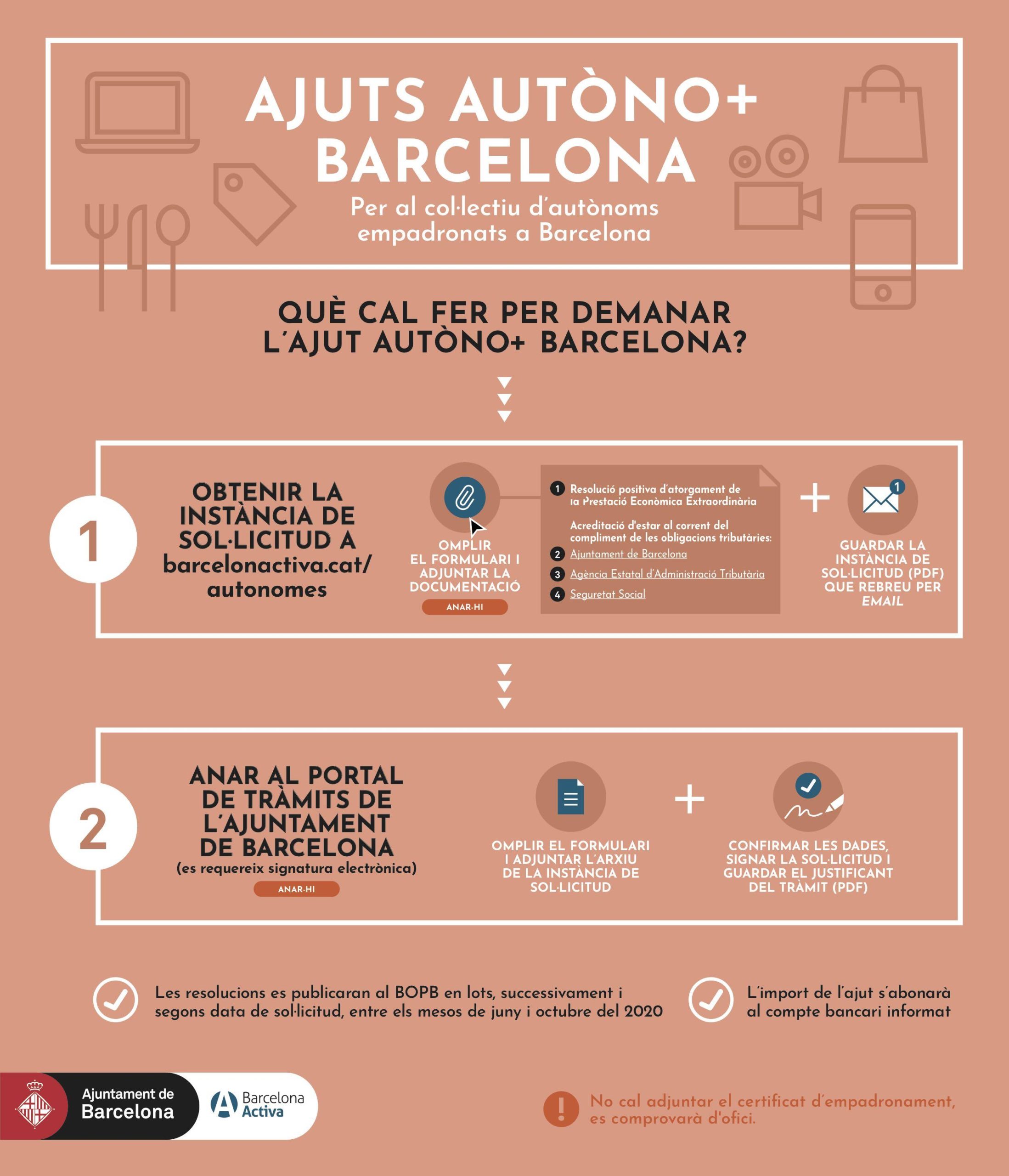 Demà, 20 de maig, s’obre el període d’inscripcions per rebre l’ajut municipal Autòno+ Barcelona. Treballadors i treballadores en règim d’autònom que ja estiguin rebent la Prestació Extraordinària estatal per haver patit una davallada del 75% en els seus ingressos, o hagin tancat la seva activitat de forma forçada per la crisi de la Covid-19, podran presentar les seves sol·licituds fins el 30 de setembre de 2020, a través del web www.barcelonactiva.cat/autonomes