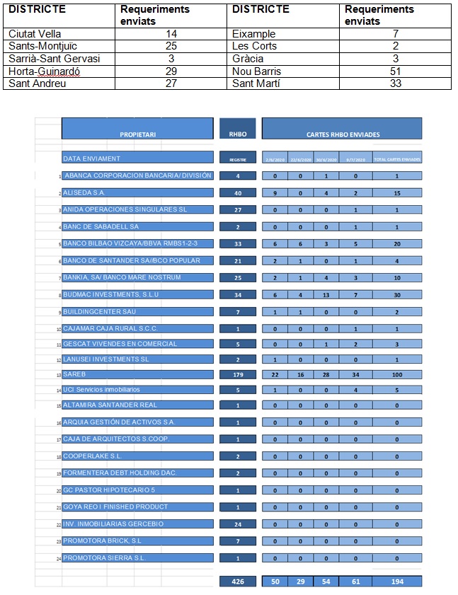 L’Ajuntament de Barcelona ha enviat un total de 194 requeriments per carta a les propietàries de 194 habitatges que d’acord amb el Registre d’habitatges buits i ocupats de l’Agència de l’habitatge de Catalunya, del total de 426 que en aquests moments apareixen inscrits com a buits i sense l’ús social que els correspon d’acord amb la legislació.