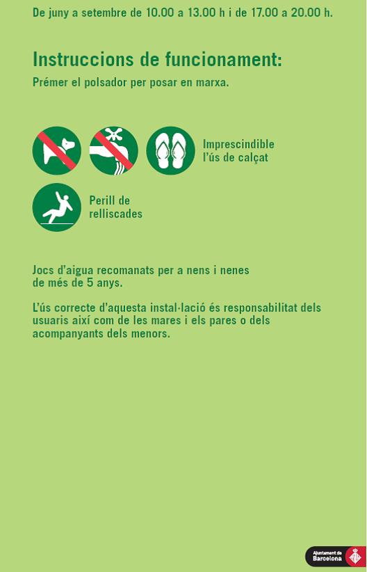 Per fer un bon ús de la font és imprescindible l’ús de calçat. L’aigua que brolla dels jocs no s’ha de consumir, i no es permet l’entrada de gossos a l’espai. A més, degut a la Covid-19, els adults i infants de més de 6 anys que estiguin fora de la zona d’aigua han d’utilitzar mascareta, cal respectar la distància de seguretat entre persones i rentar-se les mans abans i després de fer servir els jocs.