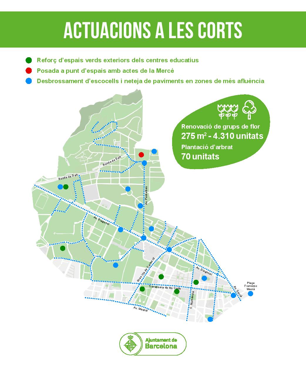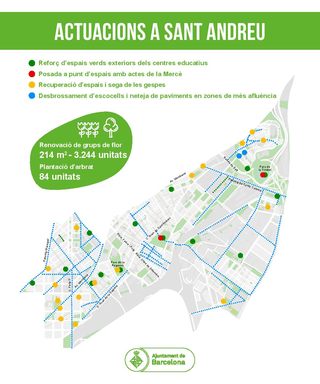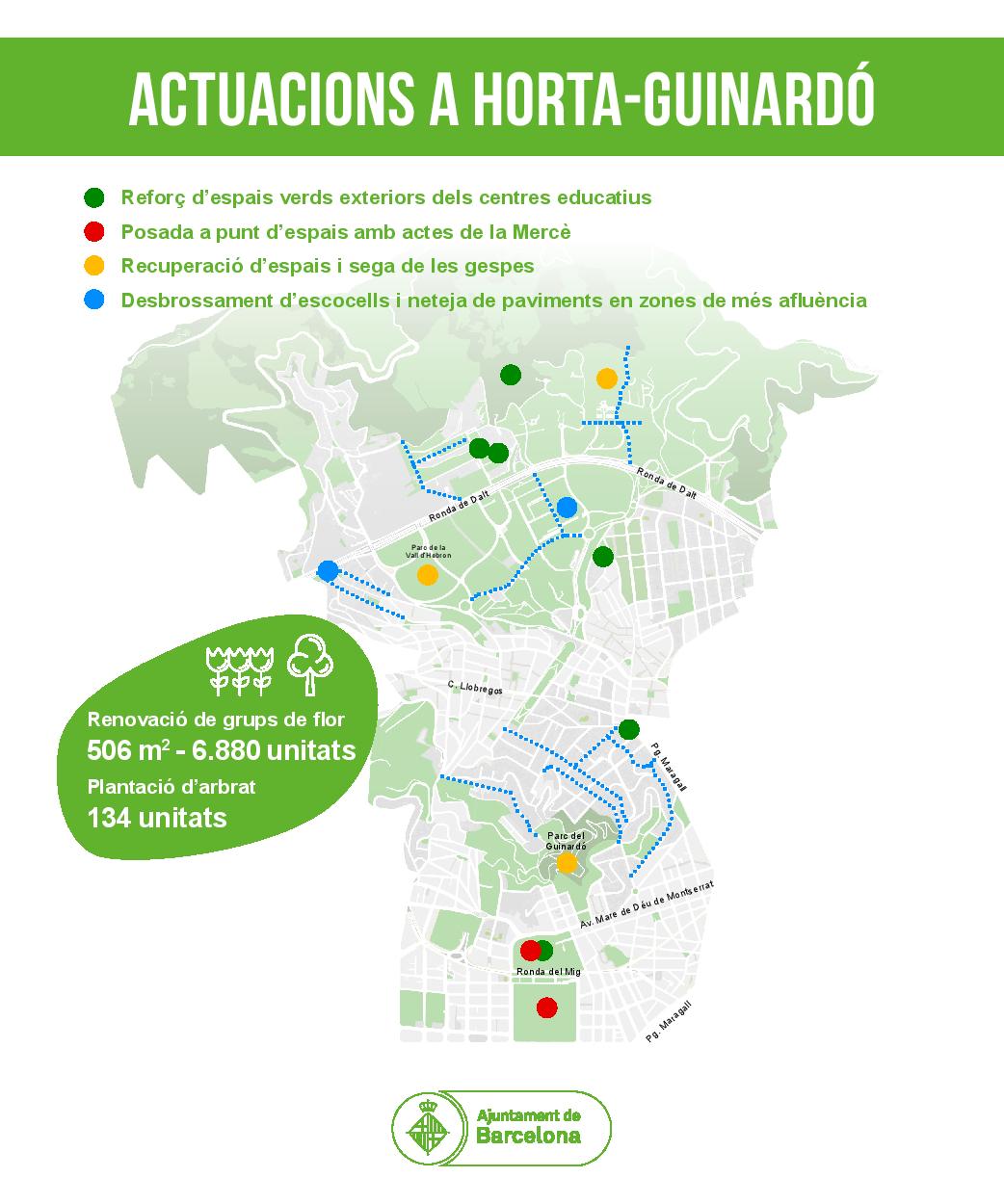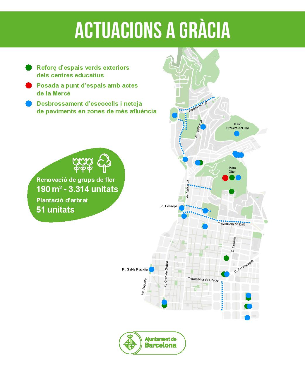Les accions previstes al Pla d’actuació del verd durant la tardor es desenvoluparan a tots els districtes. Durant el mes de setembre, ja s’ha fet el condicionament i manteniment de 26 espais verds que van ser escenari de les festes de la Mercè. Són el Parc de la Ciutadella, a Ciutat Vella; el parc de Joan Miró, el parc de l’Estació del Nord i 8 interiors d’illa, a l’Eixample; la zona del Castell de Montjuïc, els Jardins de Joan Maragall, els Jardins del Teatre Grec i els Jardins dels Drets Humans, a Sants-Montjuïc; el Jardí del Monestir de Pedralbes, a les Corts; els Jardins de Can Altimira, a Sarrià – Sant Gervasi;, els Jardins de Pla i Armengol i la zona de l’Hospital de Sant Pau, a Horta-Guinardó; la Casa de l’Aigua, el Districte de Nou Barris, el Camp de futbol Ciutat Meridiana i l’Ateneu de Nou Barris, a Nou Barris; la Fabra i Coats i el parc de la Trinitat, a Sant Andreu; i el parc del Centre del Poblenou, a Sant Martí.