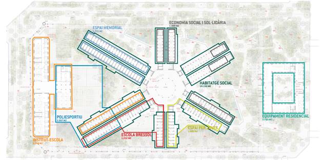 Inclou els set equipaments públics acordats al Pla Director de 2019 i es dona compliment a les reserves previstes d’habitatge públic, que es col·loca als braços del panòptic, i al futur parc urbà