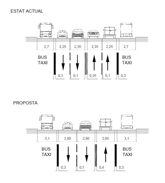 - Sentit Llobregat: Carril Bus de 3,1m + 2 carrils de circulació de 2,80m cada un.