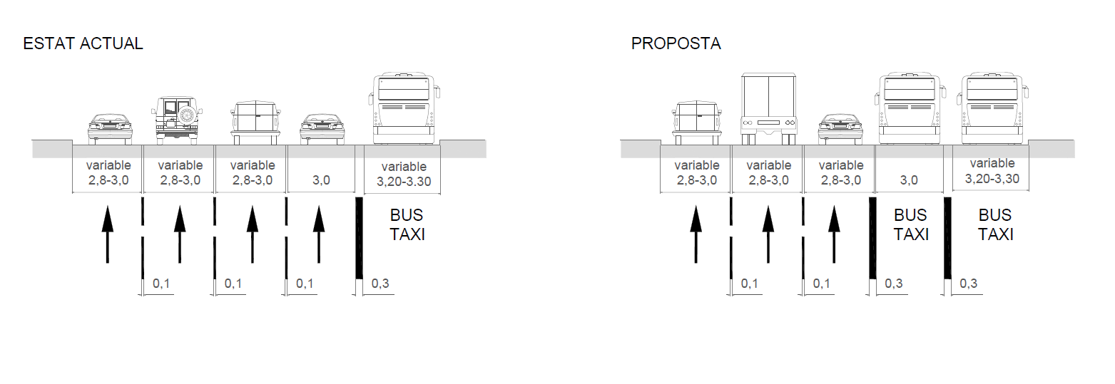 S’implanta un segon carril bus de sortida de la ciutat substituint un carril de circulació, que permeti que els busos sense parades puguin avançar els que estan parats. La secció actual és d’un carril bus i un de circulació per a cada sentit i tres carrils centrals reversibles (habitualment hi ha tres carrils de trànsit en sentit Llobregat i dos carrils en sentit Besòs). Amb la intervenció, la secció quedarà configurada amb dos carrils bus i dos carrils de circulació, en sentit Llobregat i un carril bus i dos de circulació, en sentit Besòs.